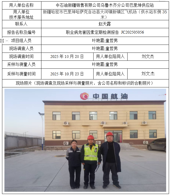 中航油新疆航空油料有限公司巴里坤供应站职业病危害因素定期检测
