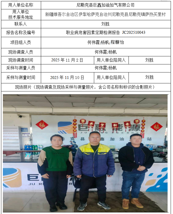 尼勒克县巨鑫加油加气有限公司职业病危害因素定期检测