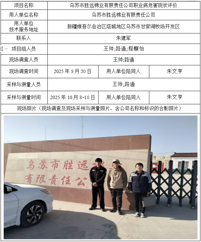 乌苏市胜远棉业有限责任公司职业病危害现状评价