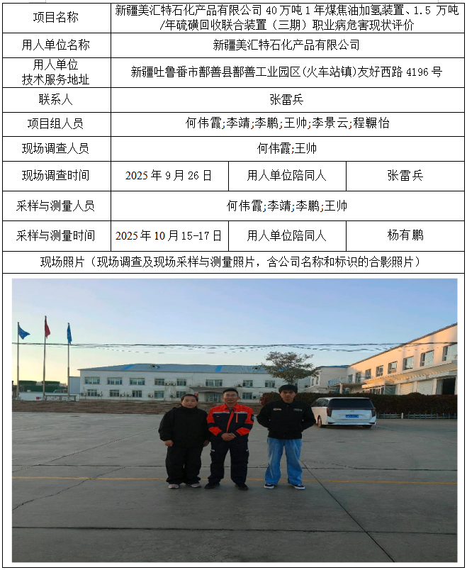 新疆美汇特石化产品有限公司40万吨1年煤焦油加氢装置、1.5 万吨/年硫磺回收联合装置(三期)职业病危害现状评价 2025-12-18 16:35:15