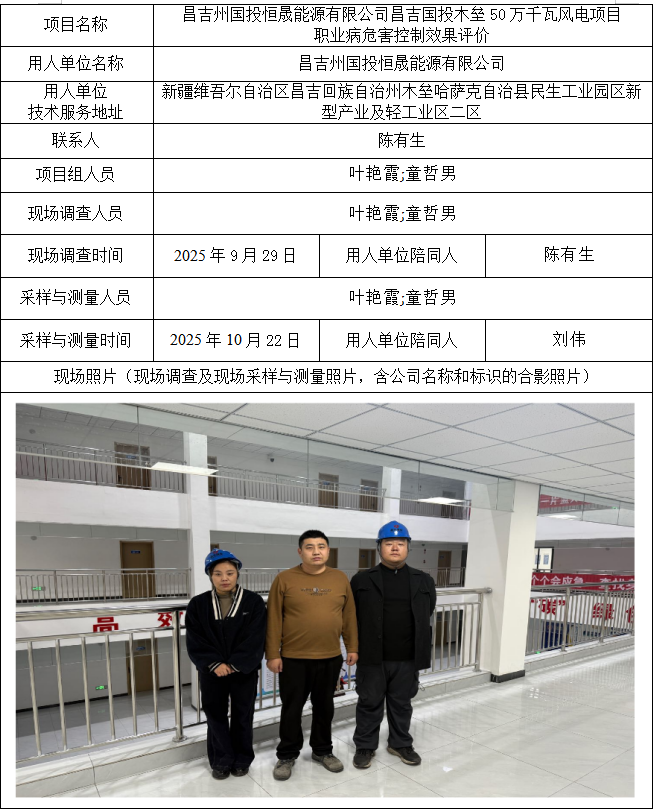 昌吉州国投恒晟能源有限公司昌吉国投木垒50万千瓦风电项目职业病危害控制效果评价