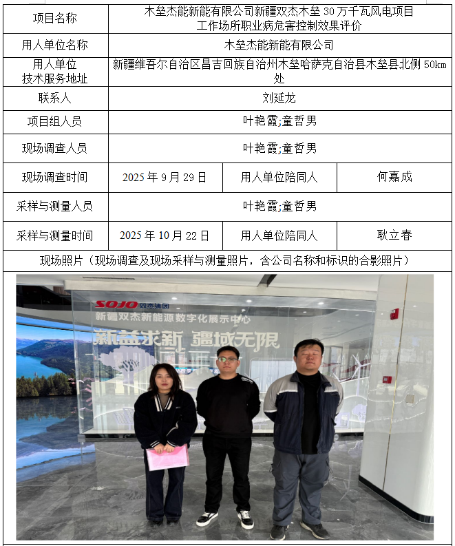 木垒杰能新能有限公司新疆双杰木垒30万千瓦风电项目工作场所职业病危害控制效果评价 2026-01-23 12:37:56