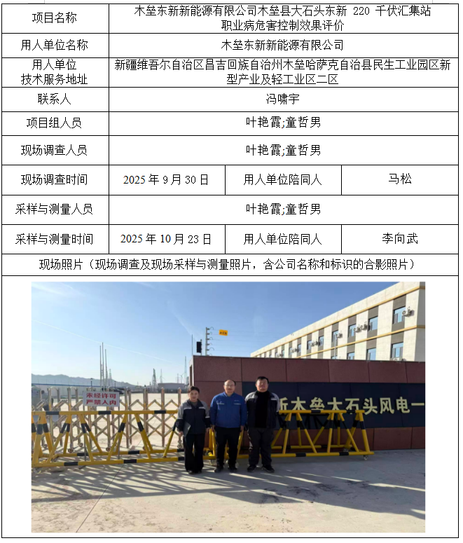 木垒东新新能源有限公司木垒县大石头东新 220 千伏汇集站职业病危害控制效果评价 2026-01-23 12:40:51