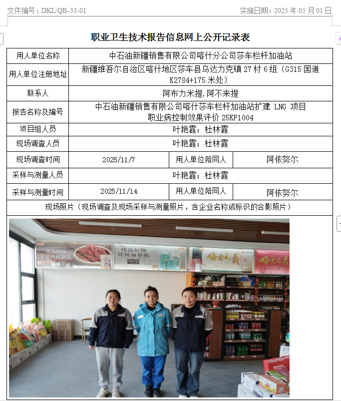 中石油新疆销售有限公司喀什莎车栏杆加油站扩建 LNG 加气项目职业病危害控制效果评价 2026-02-25 16:36:21