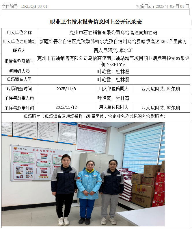克州中石油销售有限公司乌恰高速南加油站增气项目职业病危害控制效果评价