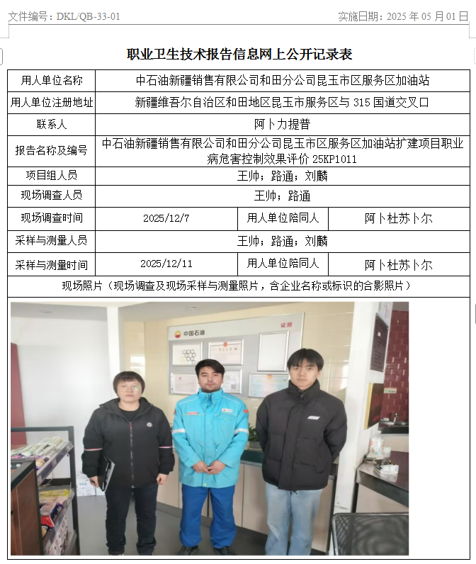 中石油新疆销售有限公司和田分公司昆玉市区服务区加油站扩建项目职业病危害控制效果评价 2026-03-04 13:31:44