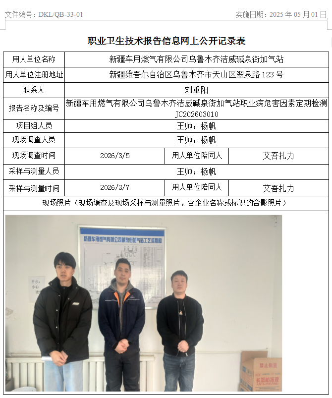 新疆车用燃气有限公司乌鲁木齐洁威碱泉街加气站职业病危害因素定期检测