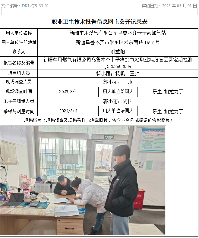 新疆车用燃气有限公司乌鲁木齐卡子湾加气站职业病危害因素定期检测