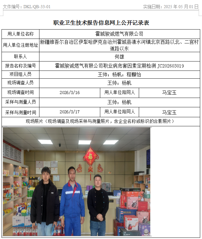 霍城骏诚燃气有限公司职业病危害因素定期检测