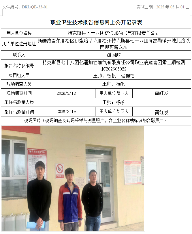特克斯县七十八团亿通加油加气有限责任公司职业病危害因素定期检测