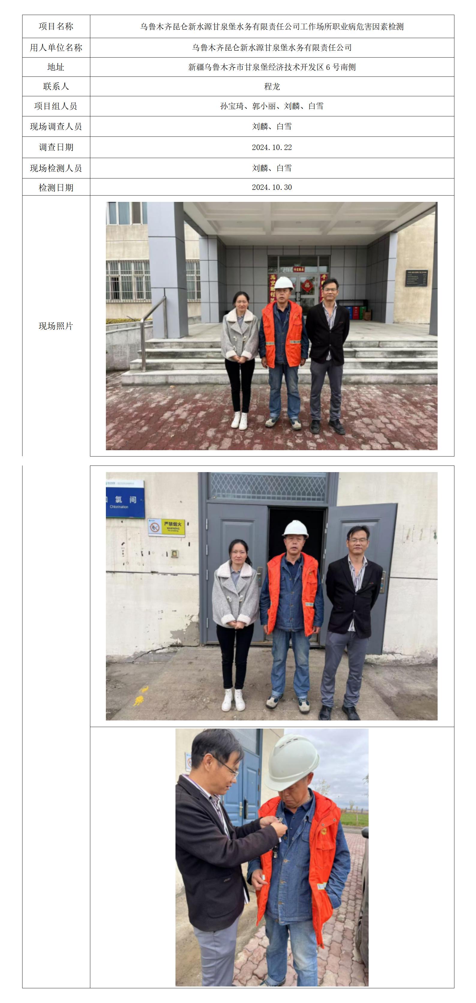 乌鲁木齐昆仑新水源甘泉堡水务有限责任公司工作场所职业病危害因素检测
