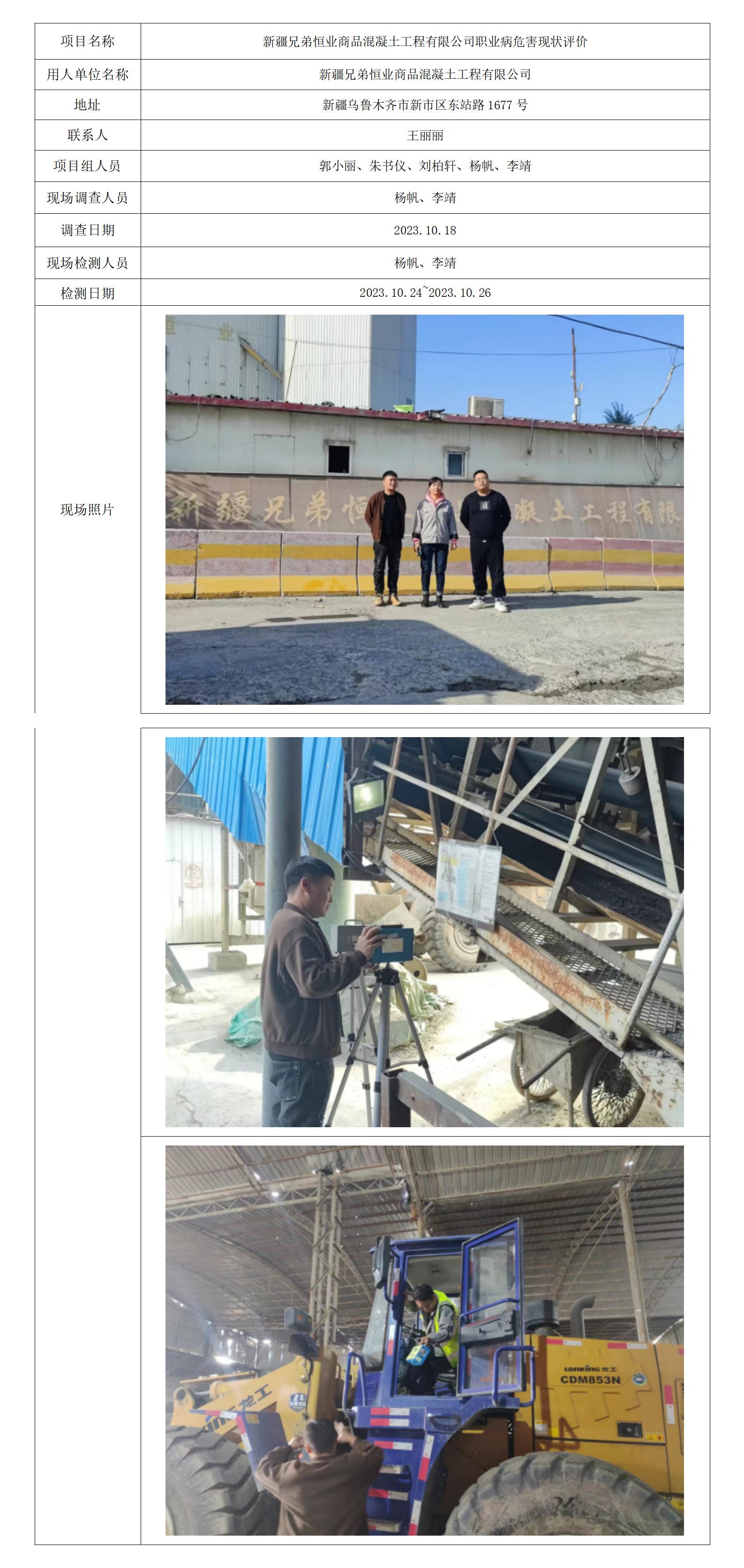 新疆兄弟恒业商品混凝土工程有限公司职业病危害现状评价