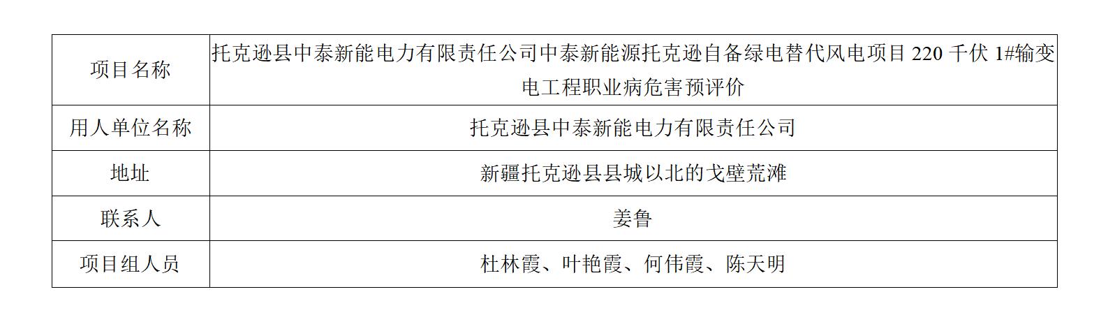 托克逊县中泰新能电力有限责任公司中泰新能源托克逊自备绿电替代风电项目220千伏1#输变电工程职业病危害预评价