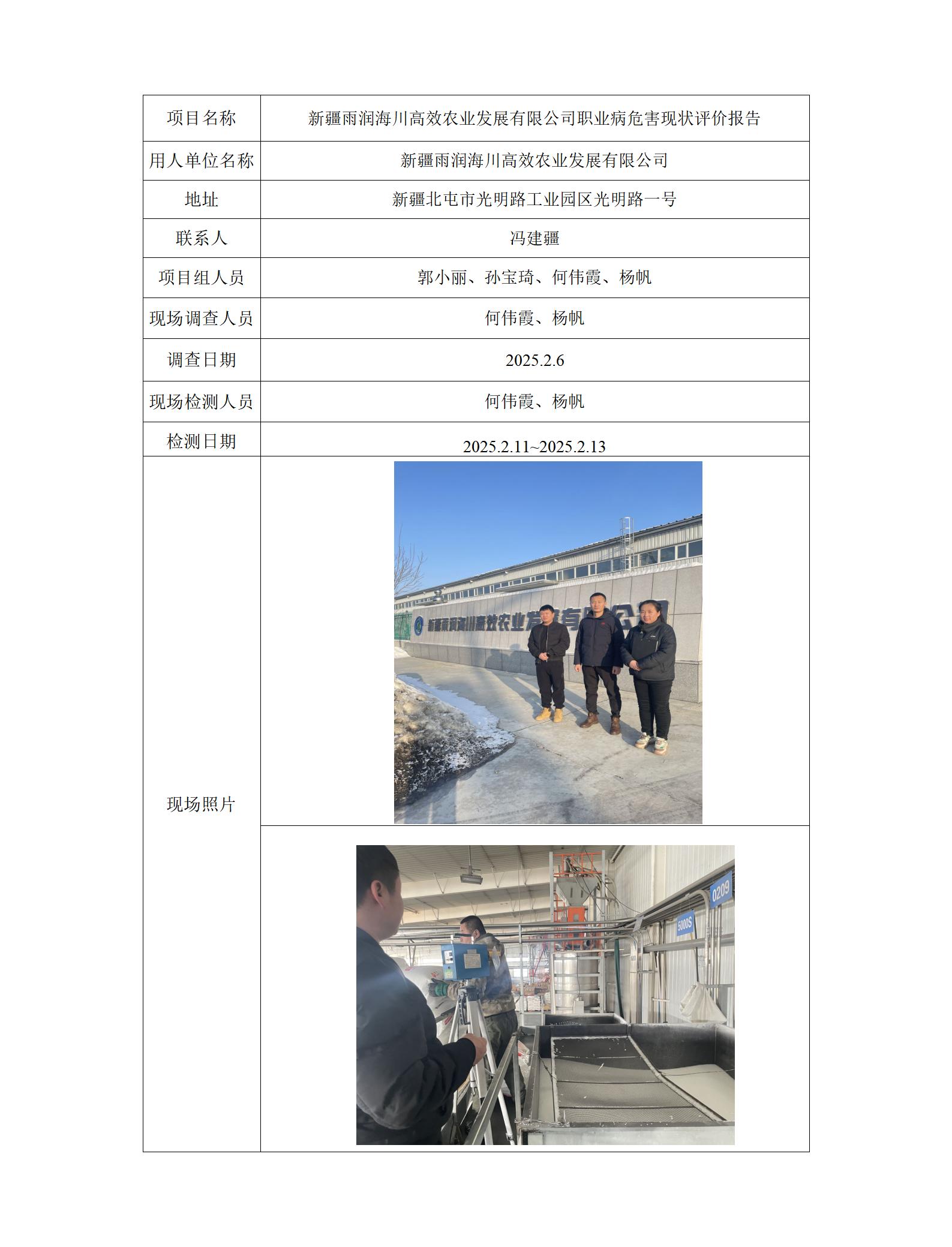 新疆雨润海川高效农业发展有限公司职业病危害现状评价