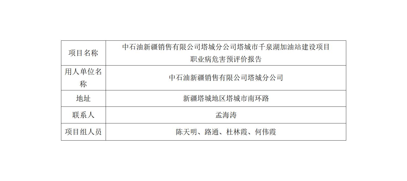 中石油新疆销售有限公司塔城分公司塔城千泉湖加油站建设项目职业病危害预评价