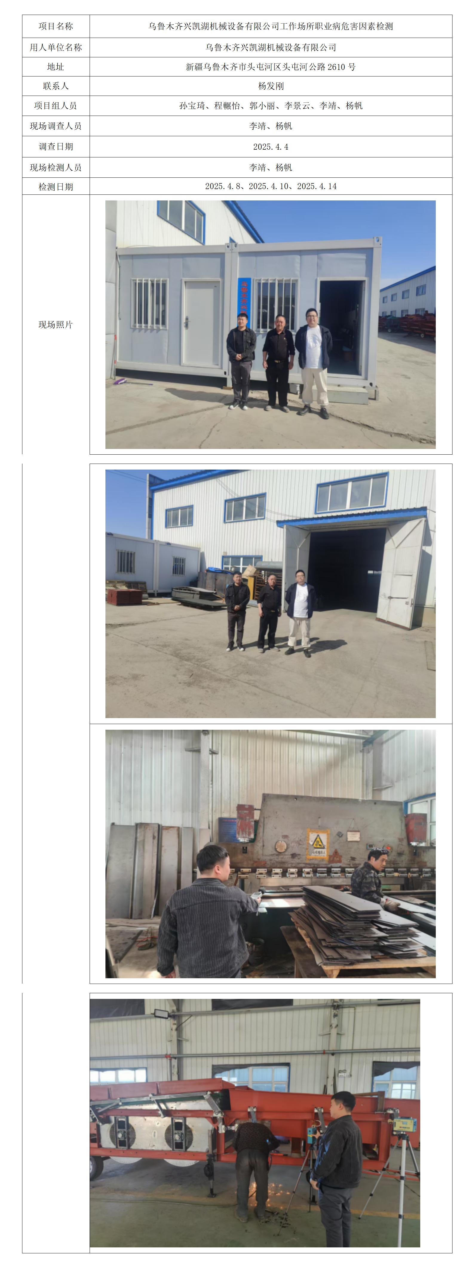 乌鲁木齐兴凯湖机械设备有限公司工作场所职业病危害因素检测