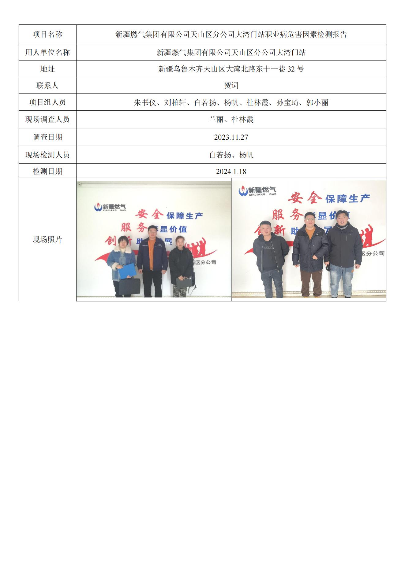 新疆燃气集团有限公司天山区分公司大湾门站工作场所职业病危害因素检测
