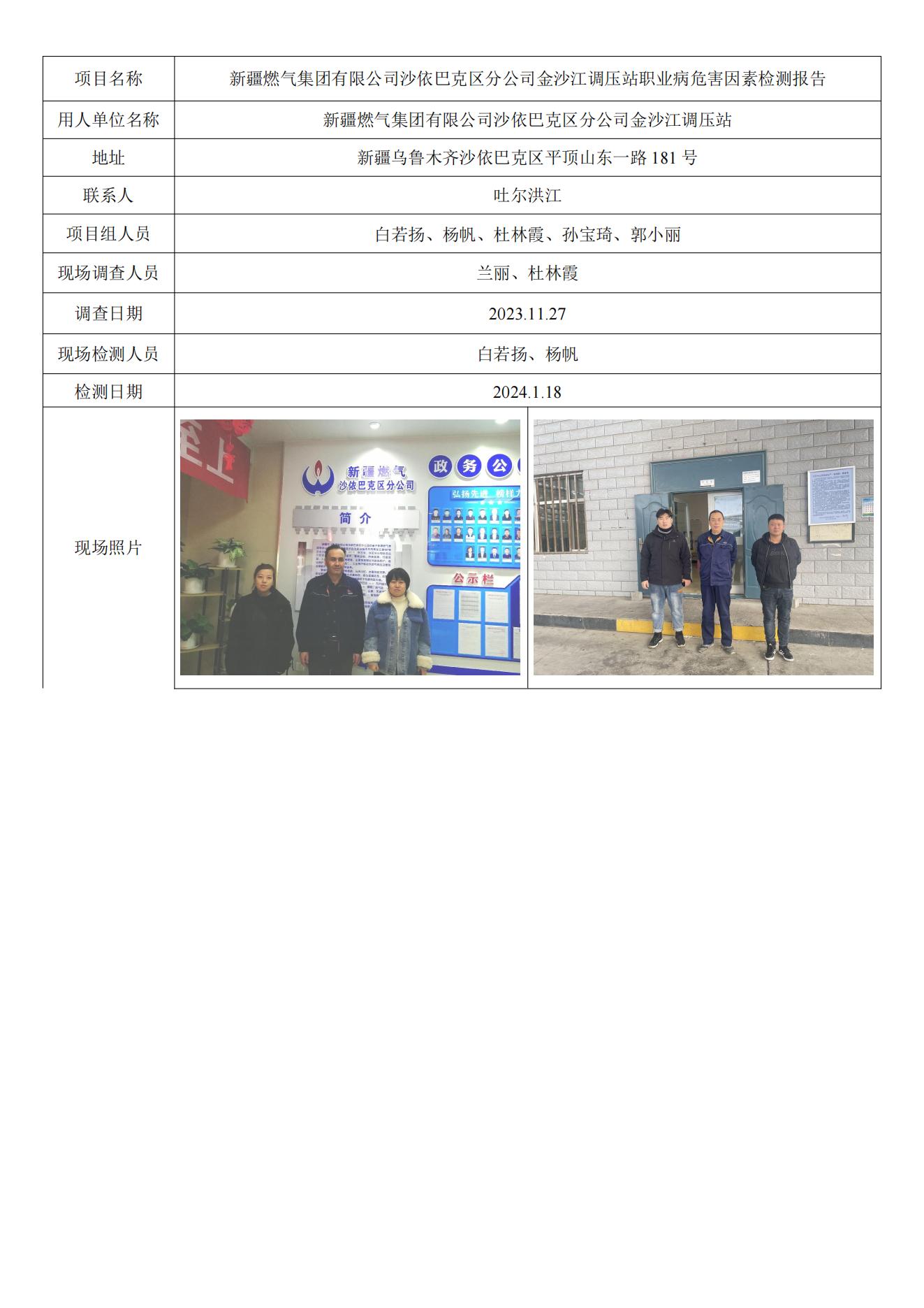 新疆燃气集团有限公司沙依巴克区分公司金沙江调压站职业病危害因素检测报告