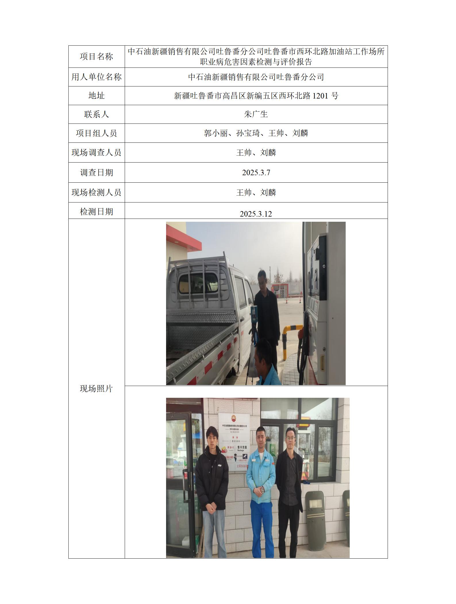 中石油新疆销售有限公司吐鲁番分公司吐鲁番市西环北路加油站工作场所职业病危害因素检测与评价报告