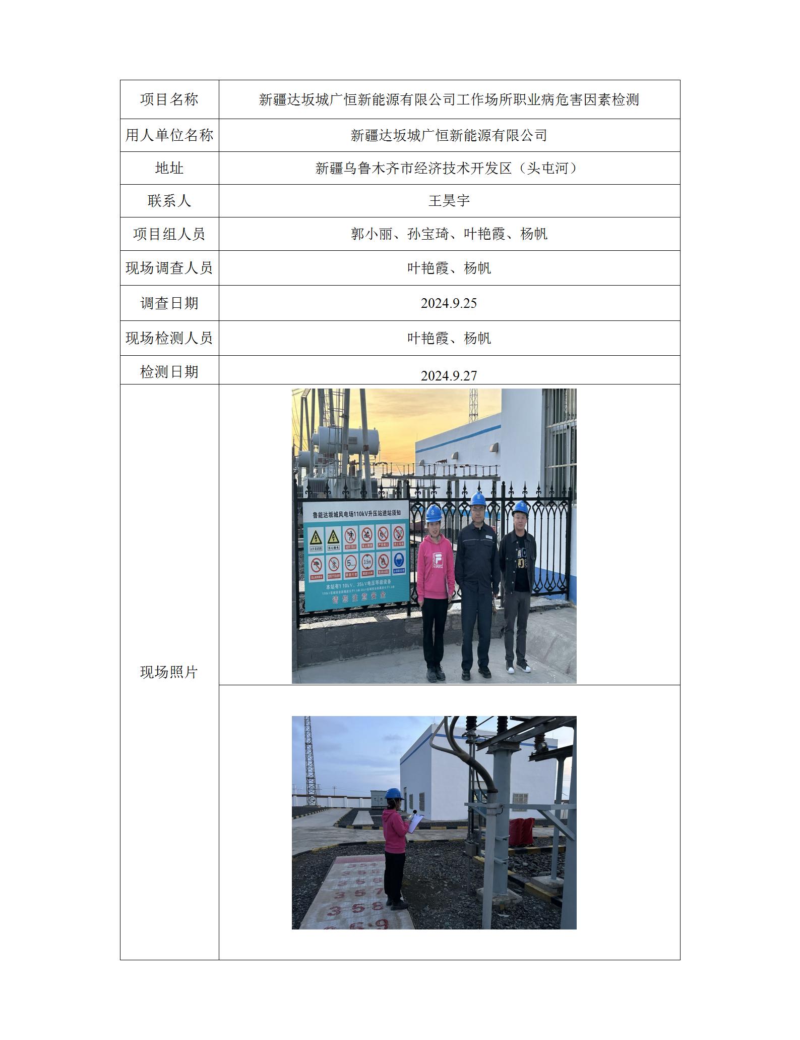 新疆达坂城广恒新能源有限公司工作场所职业病危害因素检测