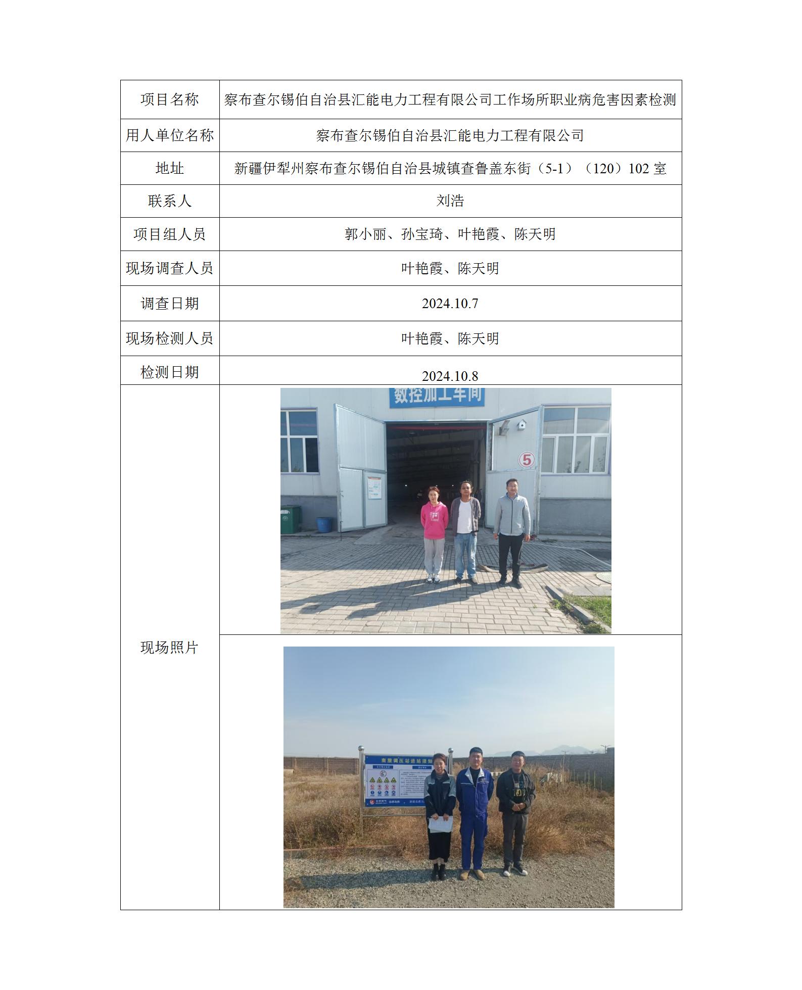 察布查尔锡伯自治县汇能电力工程有限公司工作场所职业病危害因素检测