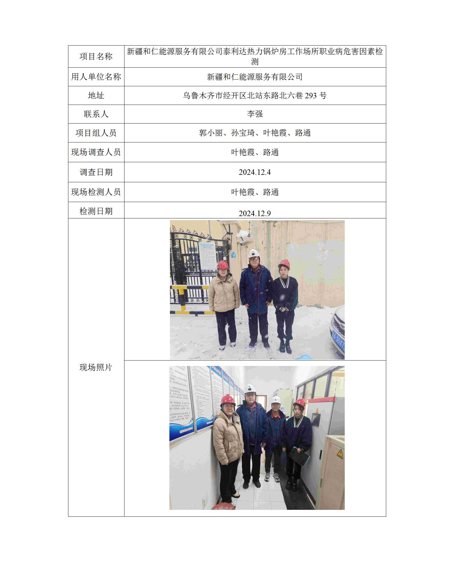 新疆和仁能源服务有限公司泰利达热力锅炉房工作场所职业病危害因素检测