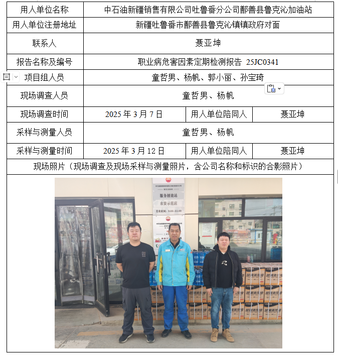中石油新疆销售有限公司吐鲁番分公司鄯善县鲁克沁加油站工作场所职业病危害因素定期检测 2025-07-01 11:25:53