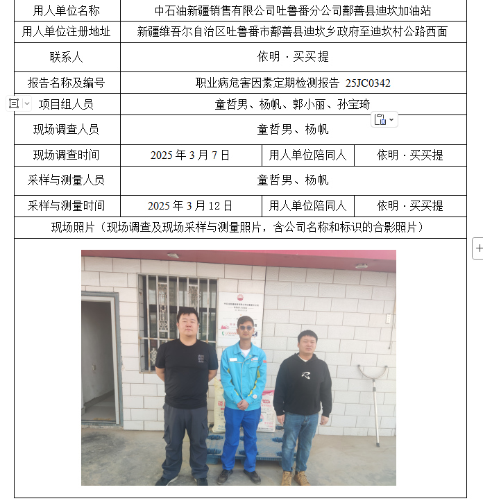 中石油新疆销售有限公司吐鲁番分公司鄯善县迪坎加油站工作场所职业病危害因素定期检测