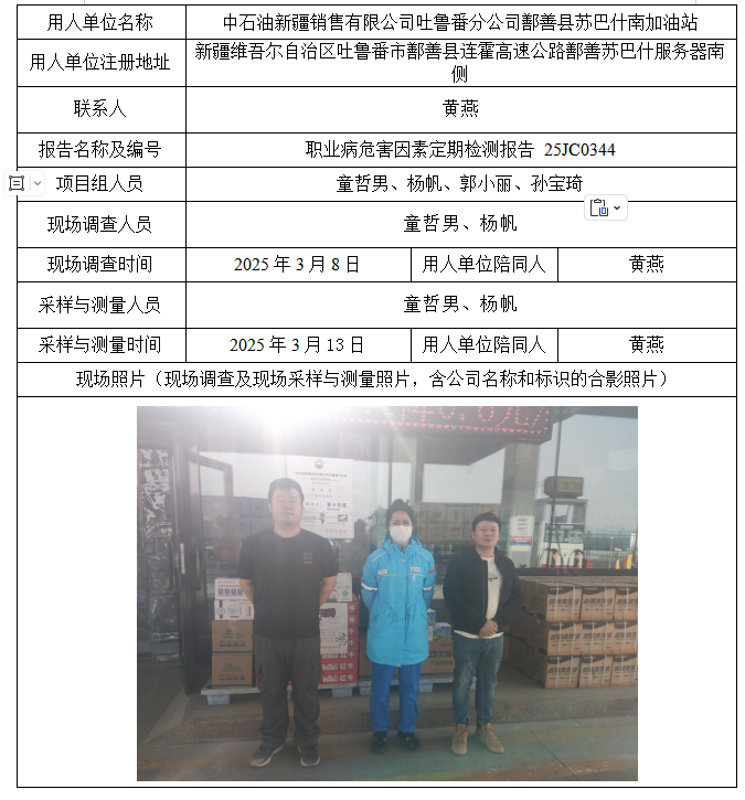 中石油新疆销售有限公司吐鲁番分公司鄯善县苏巴什南加油站工作场所职业病危害因素定期检测 2025-07-01 12:22:35