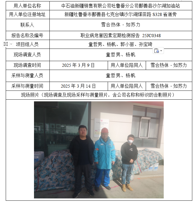 中石油新疆销售有限公司吐鲁番分公司鄯善县沙尔湖加油站工作场所职业病危害因素定期检测