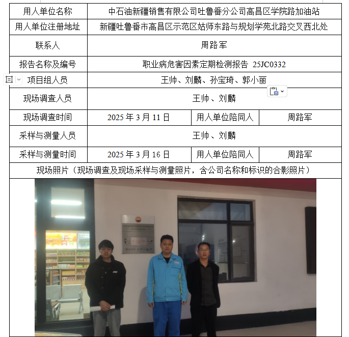 中石油新疆销售有限公司吐鲁番分公司高昌区学院路加油站工作场所职业病危害因素定期检测