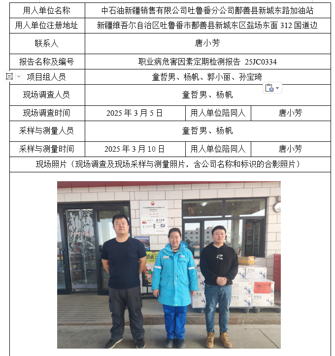 中石油新疆销售有限公司吐鲁番分公司鄯善县新城东路加油站工作场所职业病危害因素定期检测
