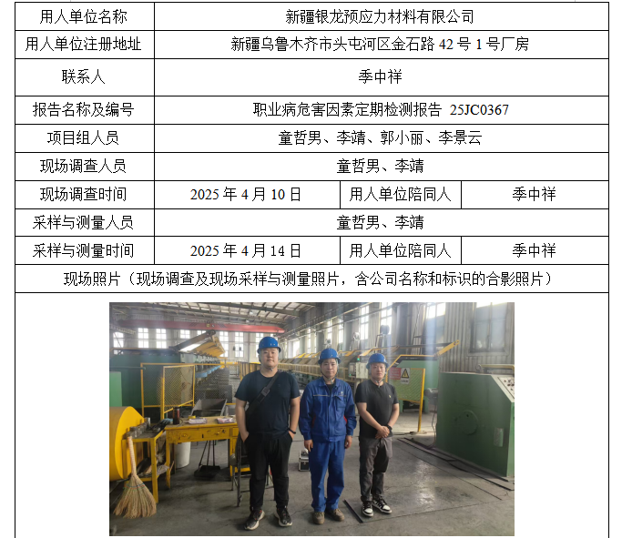 新疆银龙预应力材料有限公司工作场所职业病危害因素定期检测