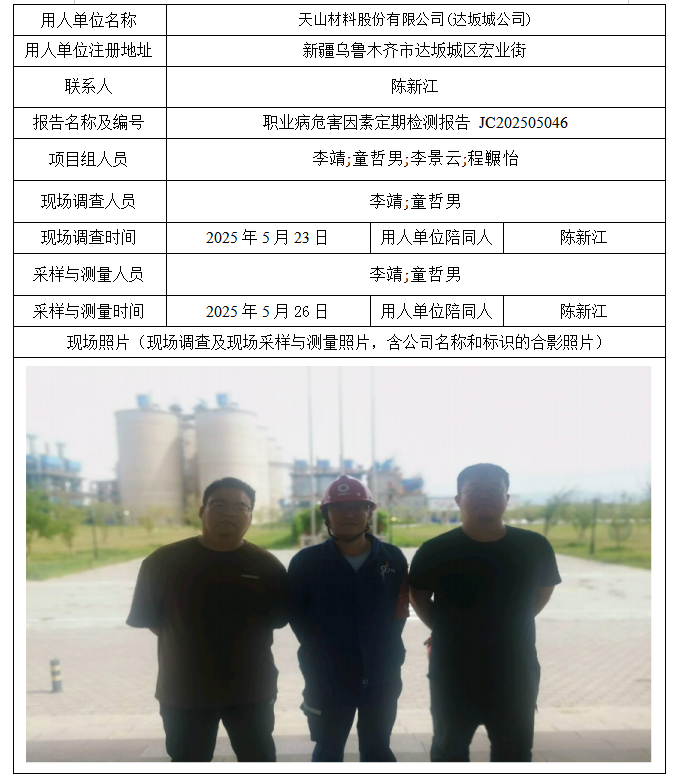 天山材料股份有限公司(达坂城公司)职业病危害因素定期检测