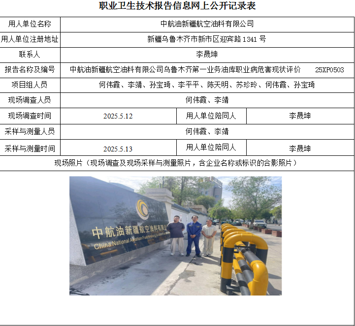 中航油新疆航空油料有限公司乌鲁木齐第一业务油库职业病危害现状评价