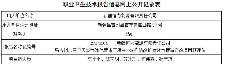 新疆恒力能源有限责任公司昌吉州东三县天然气输气管道工程- S239公路改扩建燃气管道迁改项目职业病危害预评价