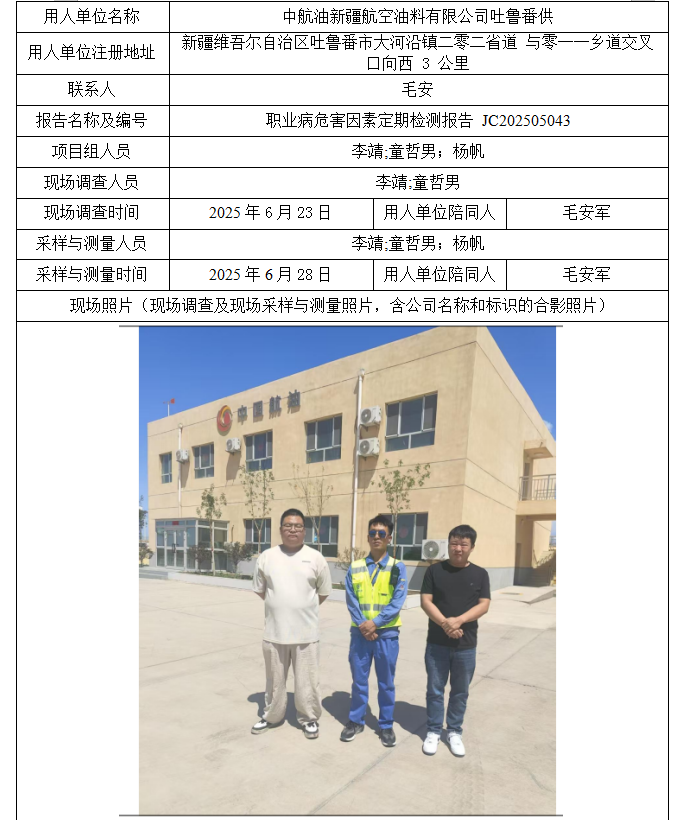 中航油新疆航空油料有限公司吐鲁番供应站职业病危害因素定期检测