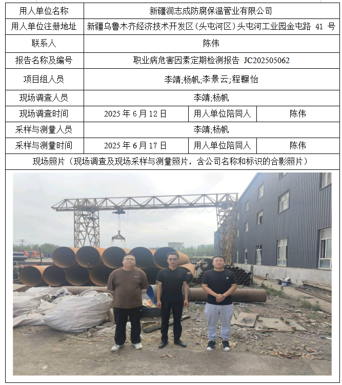 新疆润志成防腐保温管业有限公司职业病危害因素定期检测