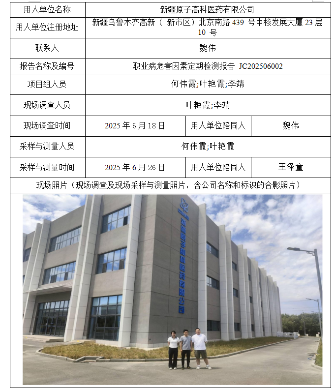 新疆原子高科医药有限公司职业病危害因素定期检测