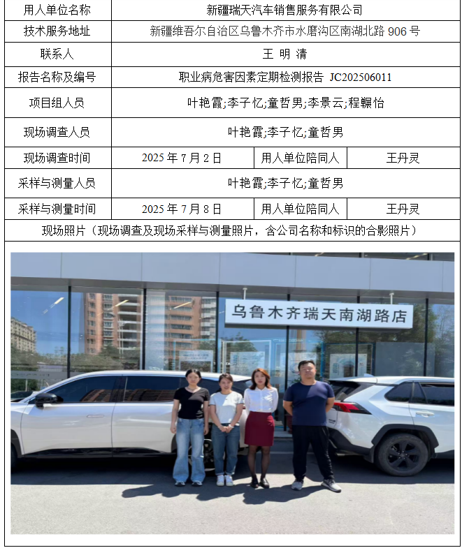 新疆瑞天汽车销售服务有限公司职业病危害因素定期检测