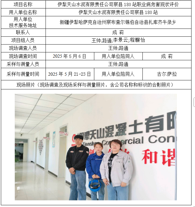 伊犁天山水泥有限责任公司察县180站职业病危害现状评价