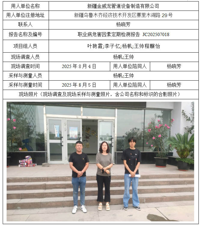 新疆金威龙管道设备制造有限公司职业病危害因素定期检测