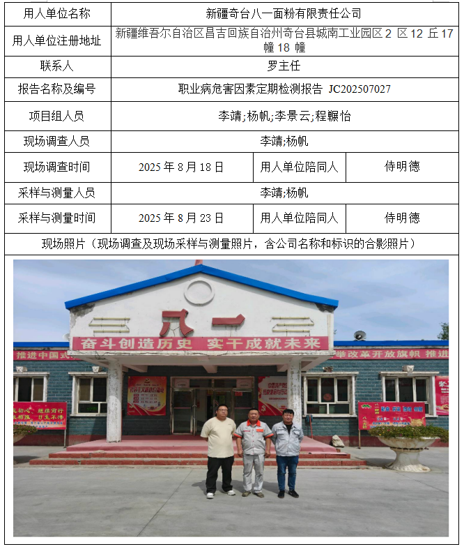 新疆奇台八一面粉有限责任公司职业病危害因素定期检测