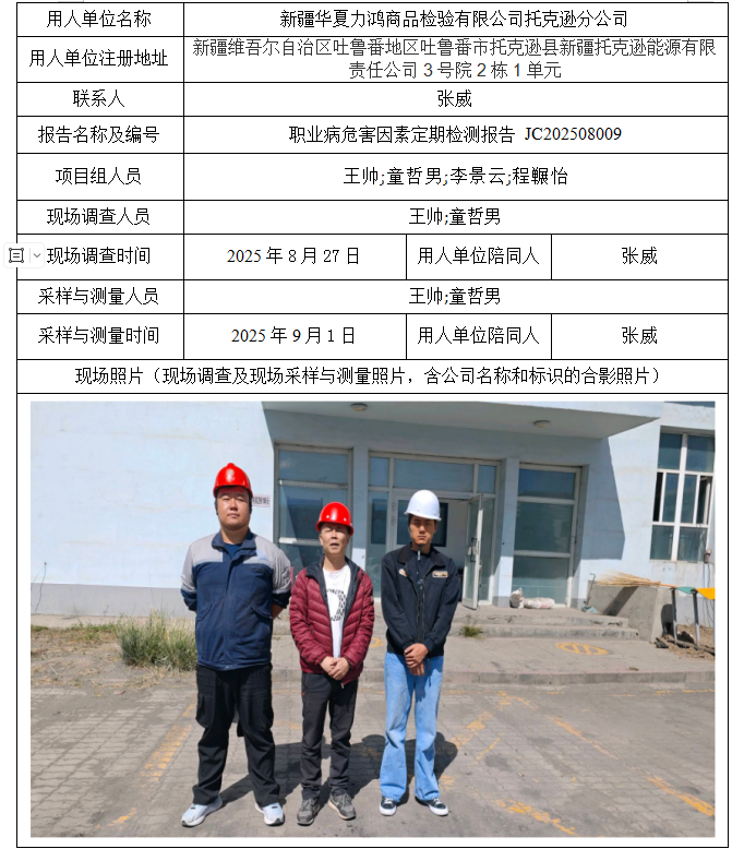 新疆华夏力鸿商品检验有限公司托克逊分公司危害因素定期检测