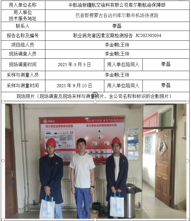 中航油新疆航空油料有限公司库尔勒航油保障部职业病危害因素定期检测