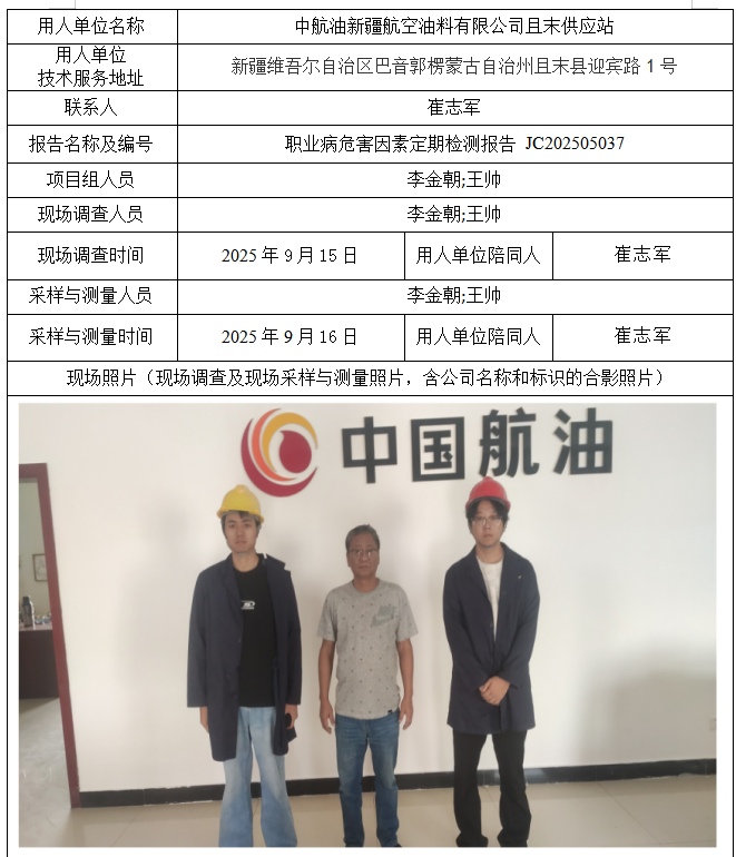 中航油新疆航空油料有限公司且末供应站职业病危害因素定期检测