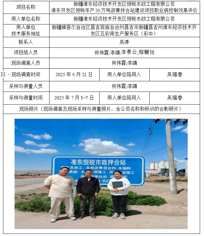 新疆准东经济技术开发区恒锐市政工程有限公司准东开发区恒锐年产30万吨沥青拌合站建设项目职业病危害控制效果评价 2025-10-13 11:17:42