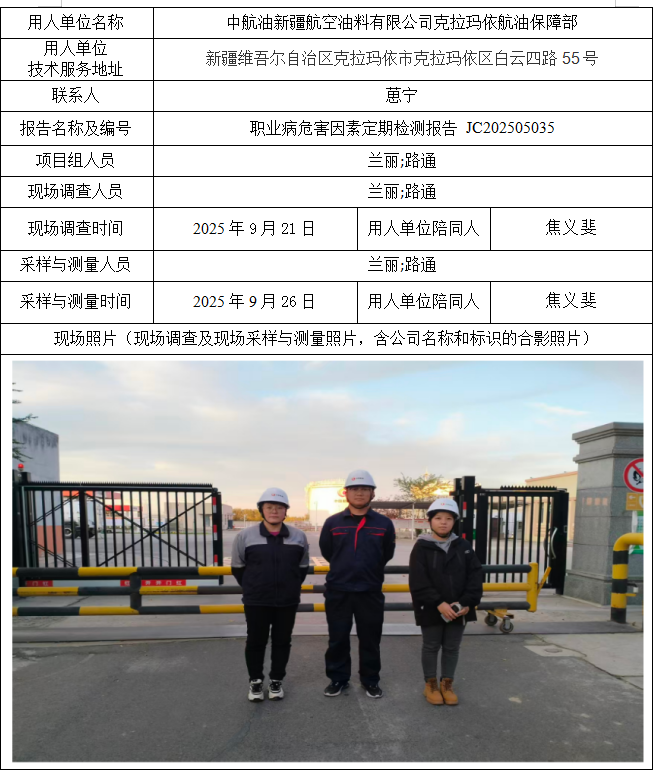 中航油新疆航空油料有限公司克拉玛依航油保障部职业病危害因素定期检测