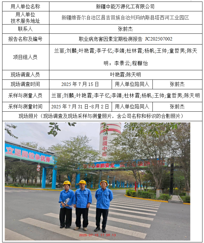 新疆中能万源化工有限公司职业病危害因素定期检测