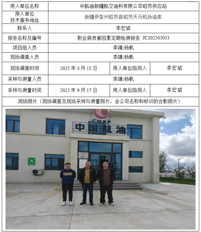 中航油新疆航空油料有限公司昭苏供应站职业病危害因素定期检测